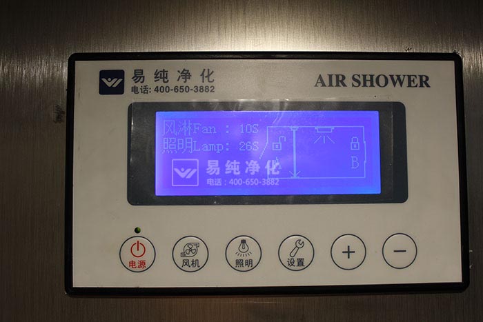 (七)風(fēng)淋控制面板為液晶藍屏顯示,且?guī)в衅聊槐Wo,易純凈化出廠的風(fēng)淋室控制面板解鎖辦法只需要連續(xù)按“—,+,照明"三鍵,聽見”滴滴"兩聲后,可進行風(fēng)淋時間,照明時間,屏保時間設(shè)置即可。