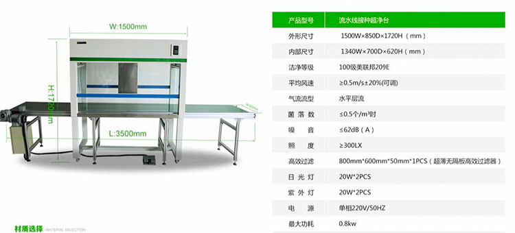 一半以上的客戶選擇食用菌專用流水線接種超凈工作臺(tái),它有怎樣的優(yōu)勢呢?1、食用菌專用流水線接種超凈工作臺(tái)設(shè)備總長為:3500*620*1720,其中超凈工作臺(tái)的尺寸為:1500mm*800mm*1720mm,這樣設(shè)計(jì)的原因是為了更好的適用食用菌生產(chǎn)工藝的流程。2、食用菌專用流水線接種超凈工作臺(tái)采用軟觸點(diǎn)控制面板開關(guān),三擋調(diào)速。3、皮帶末端裝有光電感應(yīng),已接種好的菌種不易滑落至地面。4、設(shè)備內(nèi)有紫外線和照明燈,開關(guān)獨(dú)立控制。5、200W國產(chǎn)渦輪蝸桿電機(jī),速比:1:10,變頻調(diào)速,速度2-6 m/min。6、單間輸送產(chǎn)品4KG/件。7、流水線采用電柜箱控制,分為腳踏按鈕和手動(dòng)按鈕開關(guān)控制,設(shè)計(jì)更人性化。8、皮帶寬度530mm,厚度2mm,綠色防靜電皮帶,皮帶托輥采用304不銹鋼滾筒。