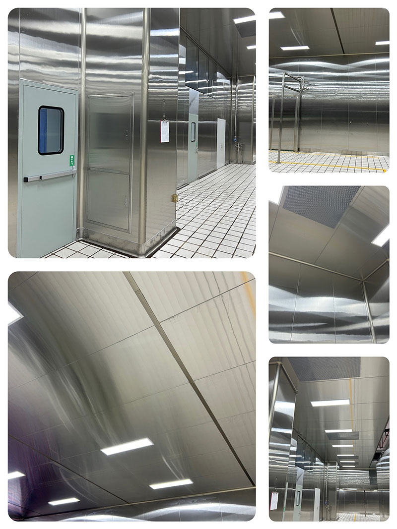車(chē)間全部采用304不銹鋼板材安裝墻面和頂面,下部安裝有不銹鋼防水墻